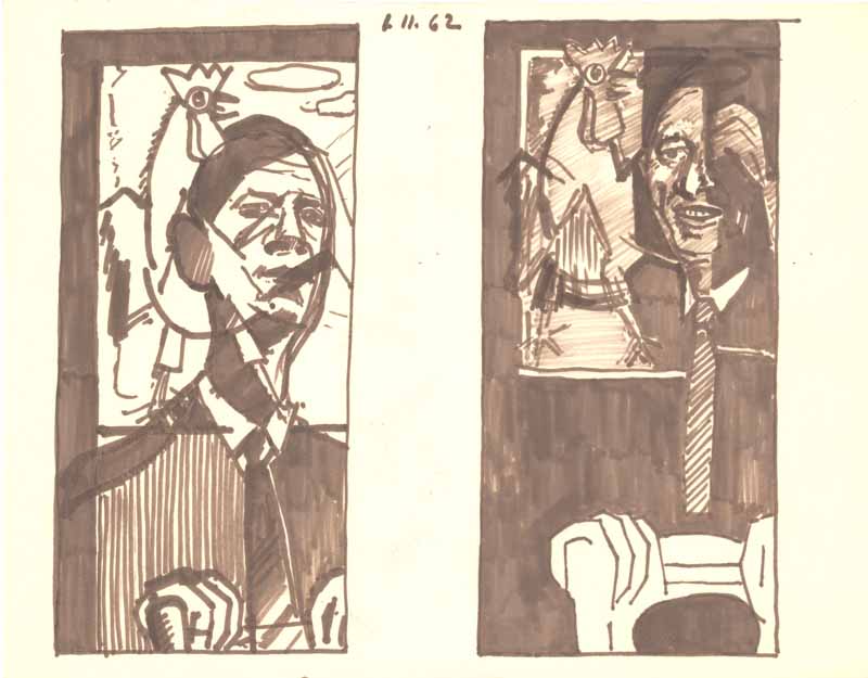 2 Porträts von Dr. Tröger, 1962; Maße: 29 x 33 cm,Graphik: Handzeichnung: Tusche auf Zeichenpapier