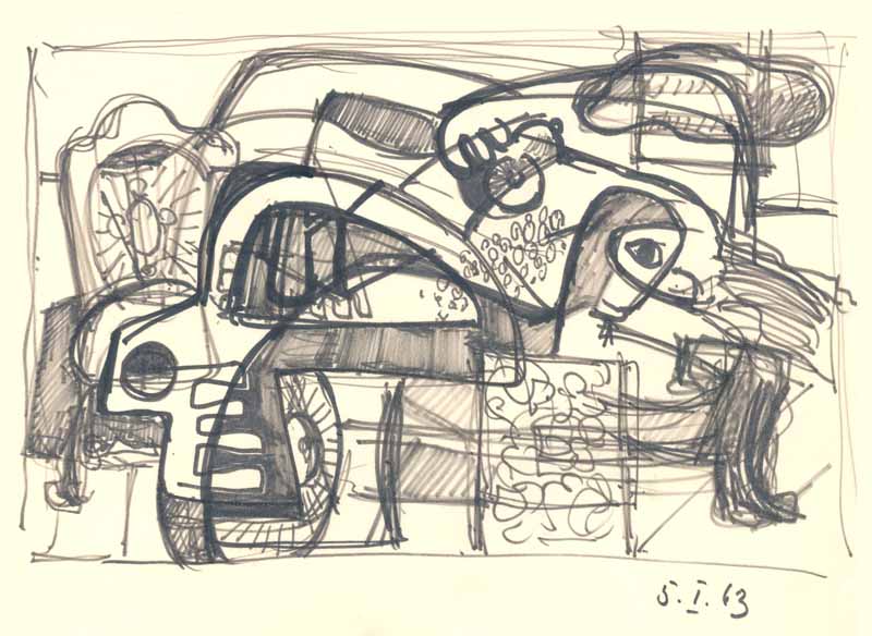Liegendes Paar mit Auto und Stuhl; 1963; Maße: 28 x 38 cm,Graphik: Handzeichnung; Tusche auf Zeichenblockpapier