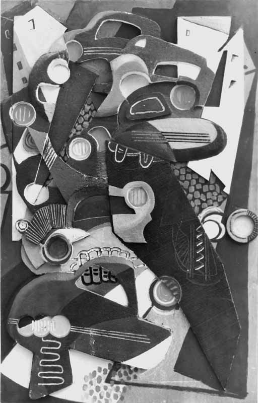 Autos (vom Künstler zerstört); 1963; Maße: 173 x 110 cm,Collage aus Styropor, Stoff, Putz, Wellpappe, Öl-/Acrylfarbe auf grundierter Spanplatte