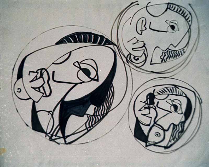 Variation "Zwei Köpfe" (3 Entwürfe für einen Keramikteller); 1963; Maße: 30 x 38 cm,Graphik: Handzeichnung; Tusche auf Zeichenpapier