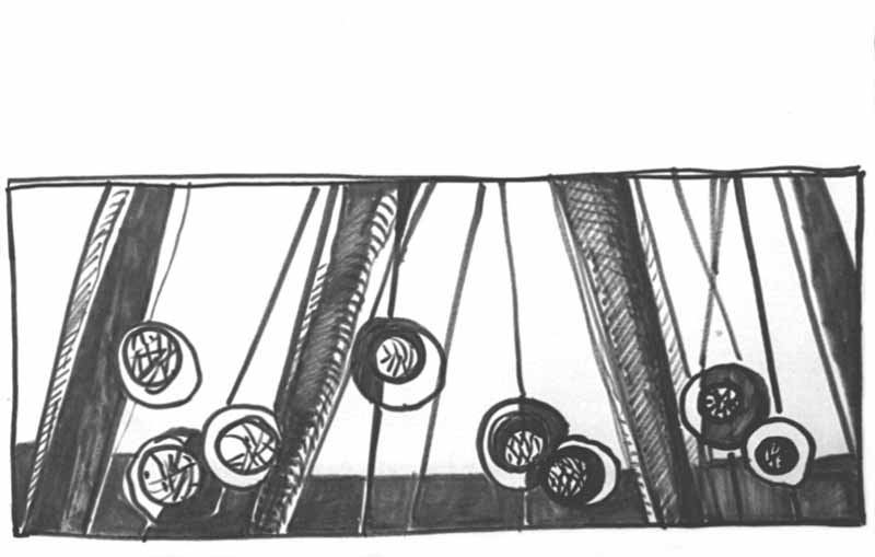 Maritime Variation mit Netzen und Kugeln; 1964; Maße: 18 x 40 cm,Graphik: Handzeichnung; Tusche auf Zeichenpapier