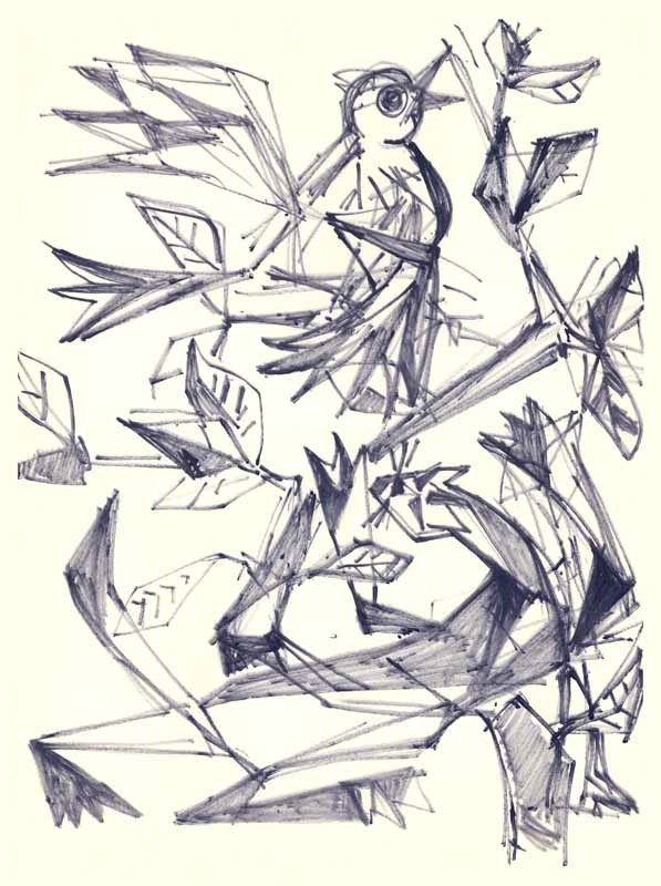 Vogel und Katze im Baum; 1964; Maße: 40 x 30 cm,Graphik: Handzeichnung; Tusche auf Zeichenpapier