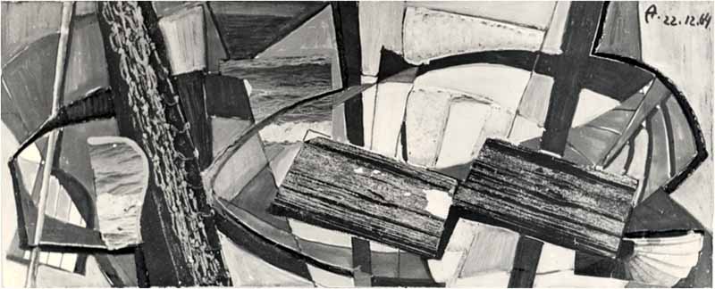 Maritime Variation mit Boot und Netz; 1964; Maße: 28 x 72 cm,Collage aus bearbeitetem Styropor, Fotos, Kunstharzputz und Verpressungen von Naturstücken wie Holz, Netz etc. und mit Öl-/Acrylfarbe bemalt