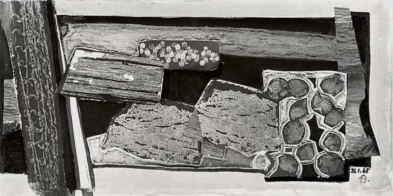Kleine maritime Variation (Maritime Variation mit Muscheln) 1965; Maße: 34 x 72 cm,Collage mit Styropor, Prägungen, aufgeklebten Fotos mit Tusche und Öl-/Acrylfarbe bemalt