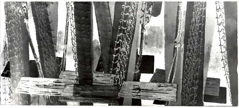 Masten - Stricke - Netze; 1965; Maße: 44 x 100 cm,Collage mit Styropor, Prägungen, aufgeklebten Fotos, mit Tusche und Öl-/Acrylfarbe bemalt