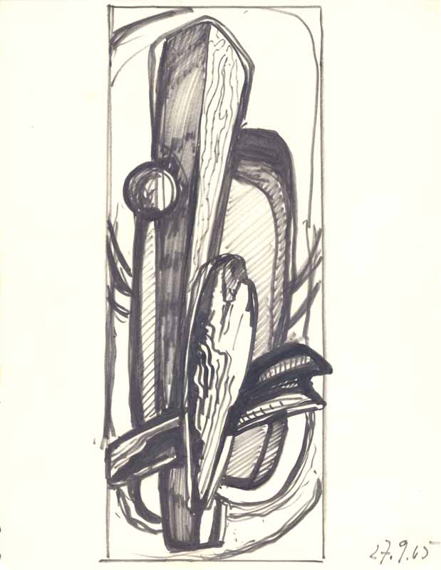 Triptychon (Entwurf zum Materialbild - rechter Flügel); 1965; Maße: 36 x 29 cm, / 41,0 x 29,7 cm,Graphik: Handzeichnung; Tusche auf Zeichenblockpapier