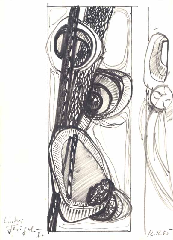 Triptychon Entwurf zum Materialbild - linker Flügel); 1965; Maße: 40 x 29 cm, / 41,0 x 29,7 cm, Graphik: Handzeichnung; Tusche auf Zeichenblockpapier