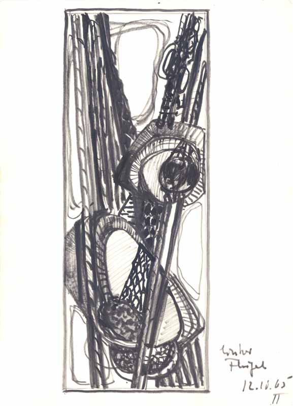 Triptychon (Entwurf zum Materialbild - linker Flügel); 1965; Maße: 40 x 24 cm, / 41,0 x 29,7 cm,Graphik: Handzeichnung; Tusche auf Zeichenblockpapier
