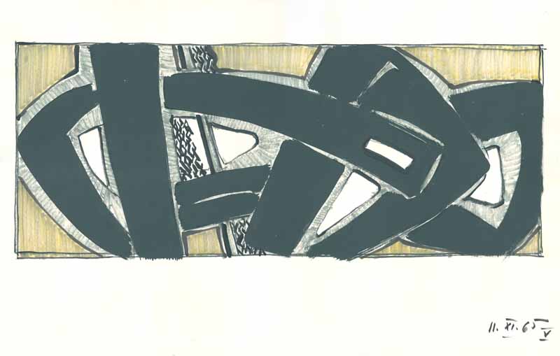 Schwarze Balken vor gelbem Grund; 1965; Maße: 22 x 59,0 cm, / 44,0 x 62,0 cm,Graphik: Handzeichnung; Tusche auf Zeichenblockpapier