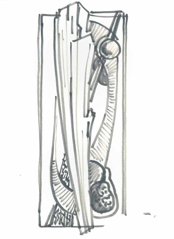 Senkrechter Balken vor Muschel und Glaskugel 1965; Maße: 40 x 23 cm, / 41,0 x 29,7 cm,Graphik: Handzeichnung; Tusche auf Zeichenblockpapier