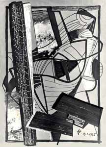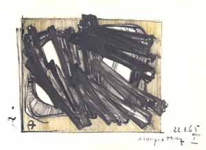 Balken vor Muschel I 1965; Maße: 35 x 50 cm, / 44 x 62 cm Graphik: Handzeichnung; Tusche auf Zeichenblockpapier; dat. u. bez. r.u. "25.XI.65; I" Erbeng. Arndt - Reg. Nr.: Z65 - 14/29 - 38