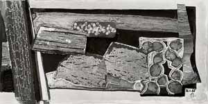 Schwarzes Holz I; 1965; Maße: 28 x 36 cm, / 28 x 36 cm, Graphik: Handzeichnung; Tusche auf Zeichenblockpapier; sign. l.u. "A", dat. u. bez. r.u. "22.II.65 schwarzes Holz I", auf RS.: "Für Friedrich zum Namenstag"; Privatbesitz F.A.; Reg. Nr.: Z65 - 22/13 - 10