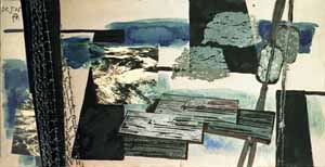 Masten - Stricke - Netze; 1965; Maße: 44 x 100 cm, Collage mit Styropor, Prägungen, aufgeklebten Fotos, mit Tusche und Öl-/Acrylfarbe bemalt; Deutsche Bundesbank, Ffm; Reg. Nr.: B65 - 60/15 - 12
