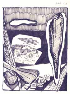 Maritime Variation "Netz, Muscheln und Wolken" 1965; Maße: 19 x 39 cm, / 29,8 x 40,0 cm, Graphik: Handzeichnung; Tusche auf Zeichenblockpapier; Erbeng. Arndt - Reg. Nr.: Z65 - 10/02 - 03