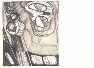 Triptychon (Entwurf zum Materialbild - rechter Flügel); 1965; Maße: 36 x 29 cm, / 41,0 x 29,7 cm, Graphik: Handzeichnung; Tusche auf Zeichenblockpapier; dat. r.u. "27. 9.65"; Erbeng. Arndt - Reg. Nr.: Z65 - 08/20 - 23