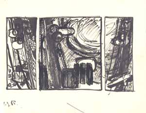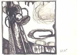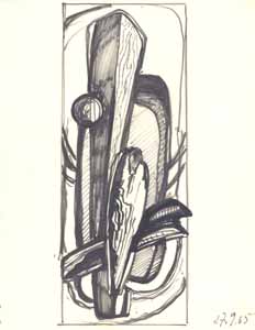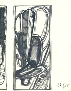 Triptychon (Entwurf zum Materialbild - rechter Flügel); 1965; Maße: 38 x 23 cm, / 41,0 x 29,7 cm, Graphik: Handzeichnung; Tusche auf Zeichenblockpapier; dat. r.u. "27. 9.65"; Erbeng. Arndt - Reg. Nr.: Z65 - 08/19 - 24