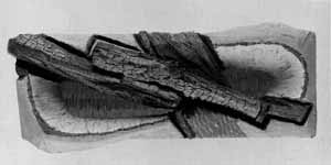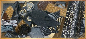 Zwei Schwarze Hölzer vor rotem Grund; 1965; Maße: 50 x 101 cm, Collage (Materialbild) aus bearbeitetem Styropor, Kunstharzputz und mit Naturstücken wie Holz, Netzen, Kork, Muscheln etc. sowie Prägungen und mit Öl-/Acrylfarbe bemalt; Privatbesitz - Reg. Nr.: B65 - 60/51 - 21