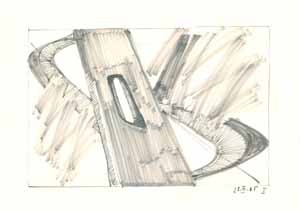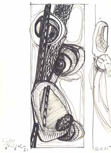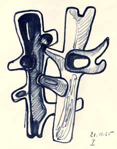 Muschelplastik mit Balken; (2 Entwürfe auf Vor- u. Rückseite); 1965; Maße: Je 37 x 29 cm / 41,0 x 29,7 cm, Graphik: Handzeichnung; Tusche auf Zeichenblockpapier; Erbeng. Arndt - Reg. Nr.: Z65 - 17/07a - 42 und Z65 - 17/07b - 43