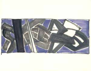 Schwarze Balken vor blauem Grund; 1965; Maße: 15 x 38 cm, / 30,0 x 38,4 cm, Graphik: Handzeichnung; Tusche auf Zeichenblockpapier; Erbeng. Arndt - Reg. Nr.: Z65 - 07/04 - 33