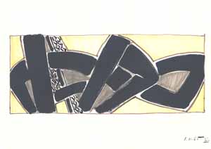 Schwarze Balken vor gelbem Grund; 1965; Maße: 34 x 60 cm, / 34 x 60 cm, Graphik: Handzeichnung; Tusche auf Zeichenblockpapier; dat. u. bez. r.u. "II.XI.65; V" Erbeng. Arndt - Reg. Nr.: Z65 - 17/13 - 37