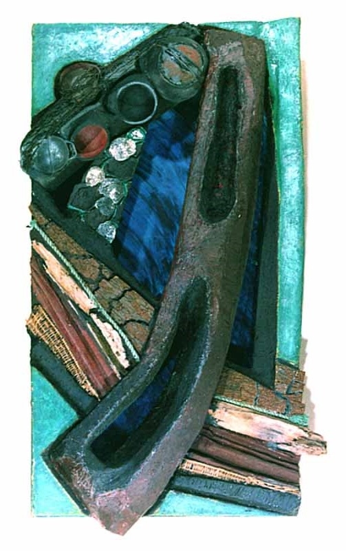 Materialbild mit querliegendem Balken, Kugeln und Muscheln; 1966; Maße: 143 x 255 cm