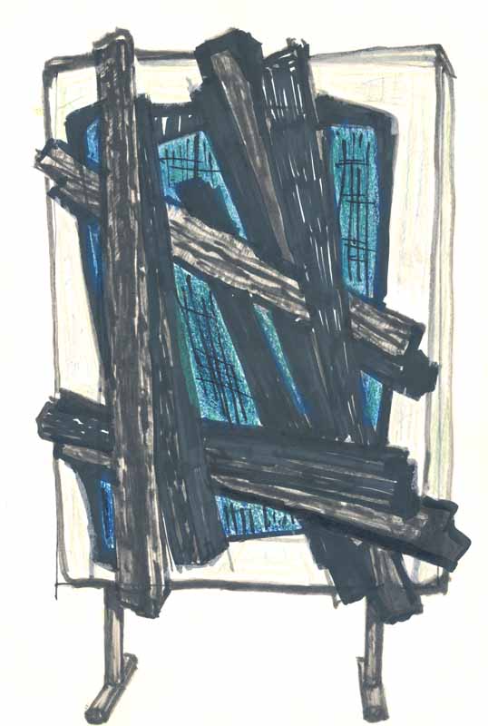 Schwarze Balken vor blauem Fenster; 1966; Maße: 38 x 24 cm, / 26,6 x 39,0 cm,Graphik: Handzeichnung; Tusche auf Zeichenblockpapier