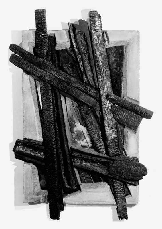 Sich schneidende schwarze Hölzer in farbigem Glas; 1966; Maße: 230 x 155 cm,Assemblage (Materialbild)