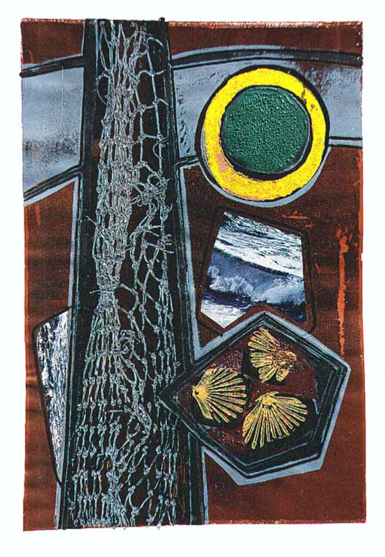 Maritime Variation A (Variation mit gelb-grünem Mond); 1966; Maße: 63 x 43 cm, / 75 x 49,5 cm,Graphik: Serigraphie mit Prägedruck und aufgeklebten Fototapeten auf Büttenpapier