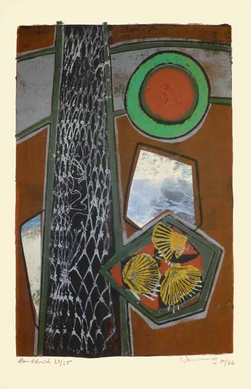 Maritime Variation A (Variation mit grün-rotem Mond); 1966; Maße: 63 x 43 cm, / 75 x 49,5 cm,Graphik: Serigraphie mit Prägedruck und aufgeklebten Fototapeten auf Büttenpapier