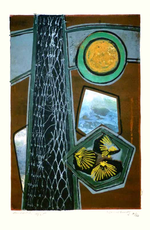 Maritime Variation A (Variation mit grün-gelbem Mond); 1966; Maße: 63 x 43 cm, / 75 x 49,5 cm,Graphik: Serigraphie mit Prägedruck und aufgeklebten Fototapeten auf Büttenpapier