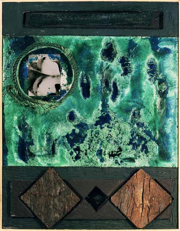 Grünblaues Feld und figürliches Fragment; 1966; Maße: 100 x 130 cm, Assemblage (Materialbild)
