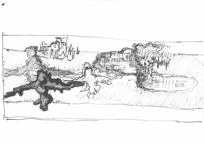 Wurzel mit eigenem Schatten; 1967; Maße: 19 x 41 cm, / 29,7 x 41,0 cm, Graphik: Handzeichnung; Tusche auf Zeichenblockpapier