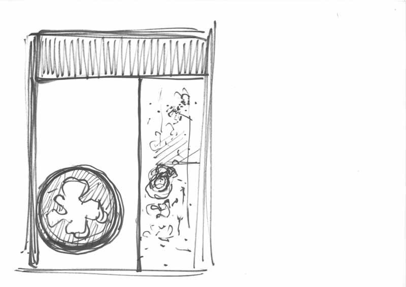 Holzstück in rundem Fenster; 1967; Maße: 27 x 20 cm, / 29,7 x 41,0 cm,Graphik: Handzeichnung; Tusche auf Zeichenblockpapier