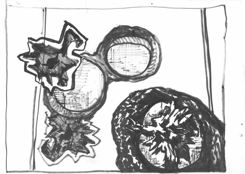 Brillenfenster mit Holzstück; 1967; Maße: 29 x 38 cm, / 29,7 x 41,0 cm,Graphik: Handzeichnung; Tusche auf Zeichenblockpapier