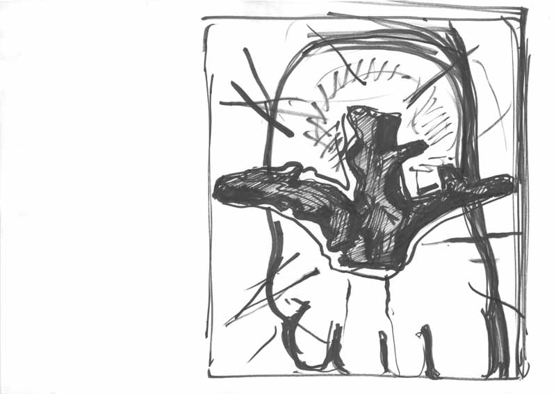 Wurzel vor Muschelfenster; 1967; Maße: 29 x 25 cm, / 29,7 x 41,0 cm,Graphik: Handzeichnung; Tusche auf Zeichenblockpapier