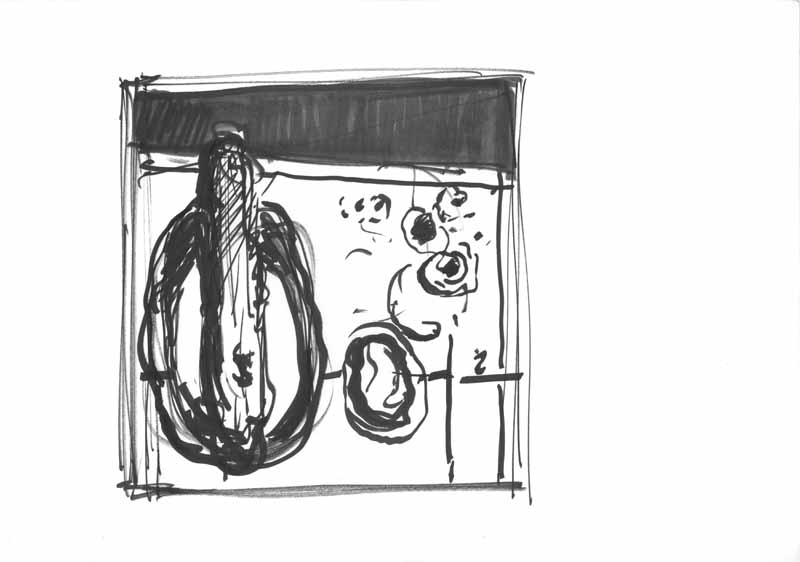 Balken vor ovalem Fenster; 1967; Maße: 22 x 38 cm, / 29,7 x 41,0 cm,Graphik: Handzeichnung; Tusche auf Zeichenblockpapier