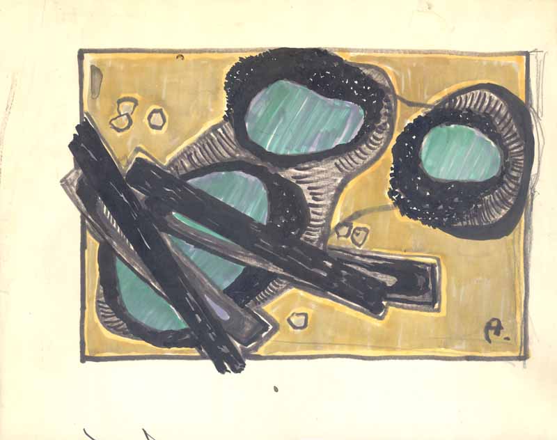 Schwarze Hölzer vor gelbem Feld und blauem Muschelfenster; 1967; Maße: 24 x 35 cm, / 43,5 x 39,0 cm,Graphik: Handzeichnung; Tusche auf Zeichenblockpapier