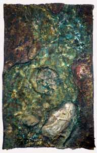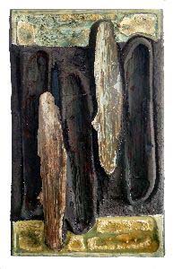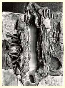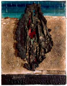 Feuerbild "Versteinerter Torso"; 1968; Maße: 100 x 61 cm, Assemblage (Materialbild): eingefärbtes, verbranntes Epoxydharz und altmeisterlich gemalter Hand in Ölfarbe; Privatbesitz, F.A. - Reg. Nr.: B68-60/52 - 06