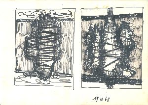 Feuerbild mit versteinertem Seil, 1968; (2 Entwürfe zum nachfolgendem Bild); Maße: 23,5 x 36,5 cm, / 29,7 x41,0 cm, Graphik: Handzeichnung; Tusche auf Zeichenblockpapier; dat. r.u. "19.10.68" Erbeng. Arndt - Reg. Nr.: E68-08/11 - 08