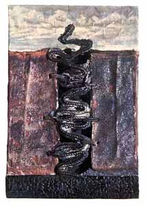 Feuerbild mit versteinertem Seil und gemaltem Himmel; 1968; Maße: 110 x 75 cm, Assemblage (Materialbild): eingefärbtes, verbranntes Epoxydharz und altmeisterlich gemaltem Himmel in Ölfarbe auf Schreinerplatte; Privatbesitz: Fr. N.K., Heidelberg - Reg. Nr.: B68-54/01 - 09