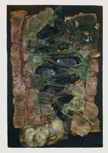 Feuerbild "Eccehomo"; 1968/69; Maße: 150 x 100 cm, Assemblage (Materialbild); sowie eingefärbtes, verbranntes Epoxydharz und altmeisterlich gemalten Fragmenten in Ölfarbe auf Tischlerplatte, Erbeng. Arndt - Reg. Nr.: B69 - 60/56 - 01