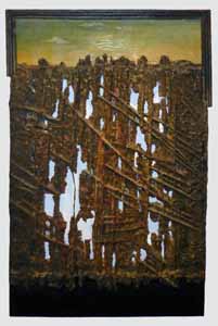 Feuerbild "Terrare Variation mit gemaltem Himmel"; 1969; Maße: 188 x 120 cm, Assemblage (Materialbild);sowie eingefärbtes, verbranntes Epoxydharz und altmeisterlich gemaltem Himmel in Ölfarbe auf Tischlerplatte, Erbeng. Arndt - Reg. Nr.: B69 - 57/01 - 06