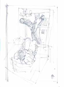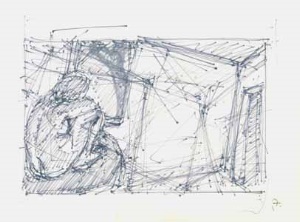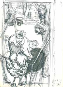 Cager in der Stadt, 1977, Maße: 35 x 23 cm, PM: 41 x 30 cm, Zeichnung: Bleistift auf Zeichenblockpapier, Erbeng. Arndt - Reg.Nr.: E77-10/31