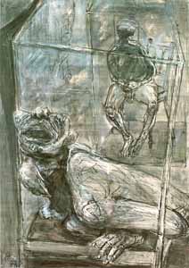 Hockende im Cager, 1977, Maße: 26 x 36 cm, PM: 41 x 30 cm, Zeichnung: Tusche auf Zeichenpapier,sign. ru"A.", Erbeng. Arndt - Reg.Nr.: E77-10/26
