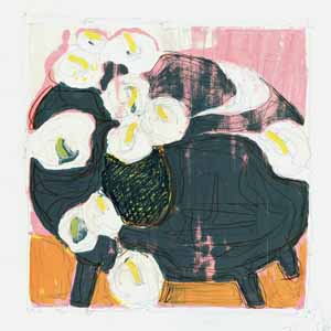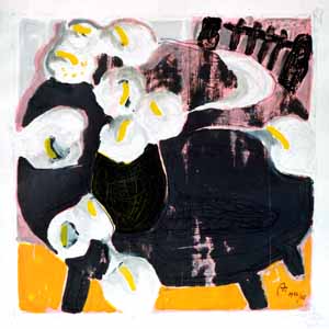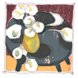 Calablüten auf dunklem Tisch; 1978, 51 x 50 cm, Grafik: Siebdruck/Handzeichnung: Tusche/Acryl auf weißem Zeichenpapier, Erbeng. Arndt - Reg.Nr.: Z78-07/12