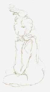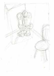 Der Kauernde im Cager mit Stuhl; 1979, Maße: 38 x 26 cm, Grafik: Handzeichnung: Bleistift auf Zeichenblockpapier Erbeng. Arndt - Reg.Nr.: E79-10/34