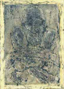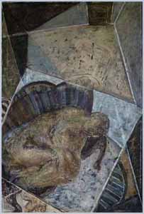 Sitzende im dunklen Käfig; 1979, Maße: 141 x 89 cm, Gemälde: Mischtechnik, Öl/Acryl auf grundierter Tischlerplatte, sign. u. dat. A.79, r.u. Erbeng. Arndt - Reg.Nr.: B79-70/82