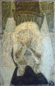 Sitzender, Kopf in den Händen I; 1979, Maße: 141 x 89 cm, Gemälde: Mischtechnik, Öl/Acryl auf grundierter Tischlerplatte, sign. u. dat. A.79, r.u. Erbeng. Arndt - Reg.Nr.: B79-70/86