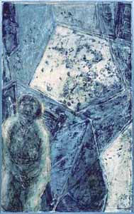 Frau mit zwei Schatten; 1979, Maße: 141 x 89 cm, Gemälde: Mischtechnik, Öl/Acryl auf grundierter Tischlerplatte, sign. u. dat. A.79, r.u. Erbeng. Arndt - Reg.Nr.: B79-70/89