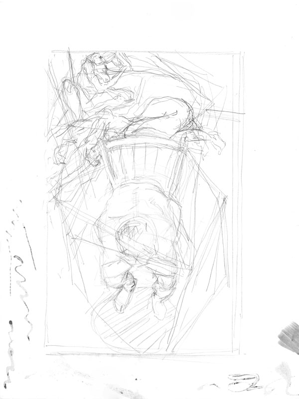 Die Party; 1980; Maße : 38 x 24 cm; Graphik: Handzeichnung; Bleistift auf Zeichenpapier (Skizze zum gleichnamigen Gemälde)